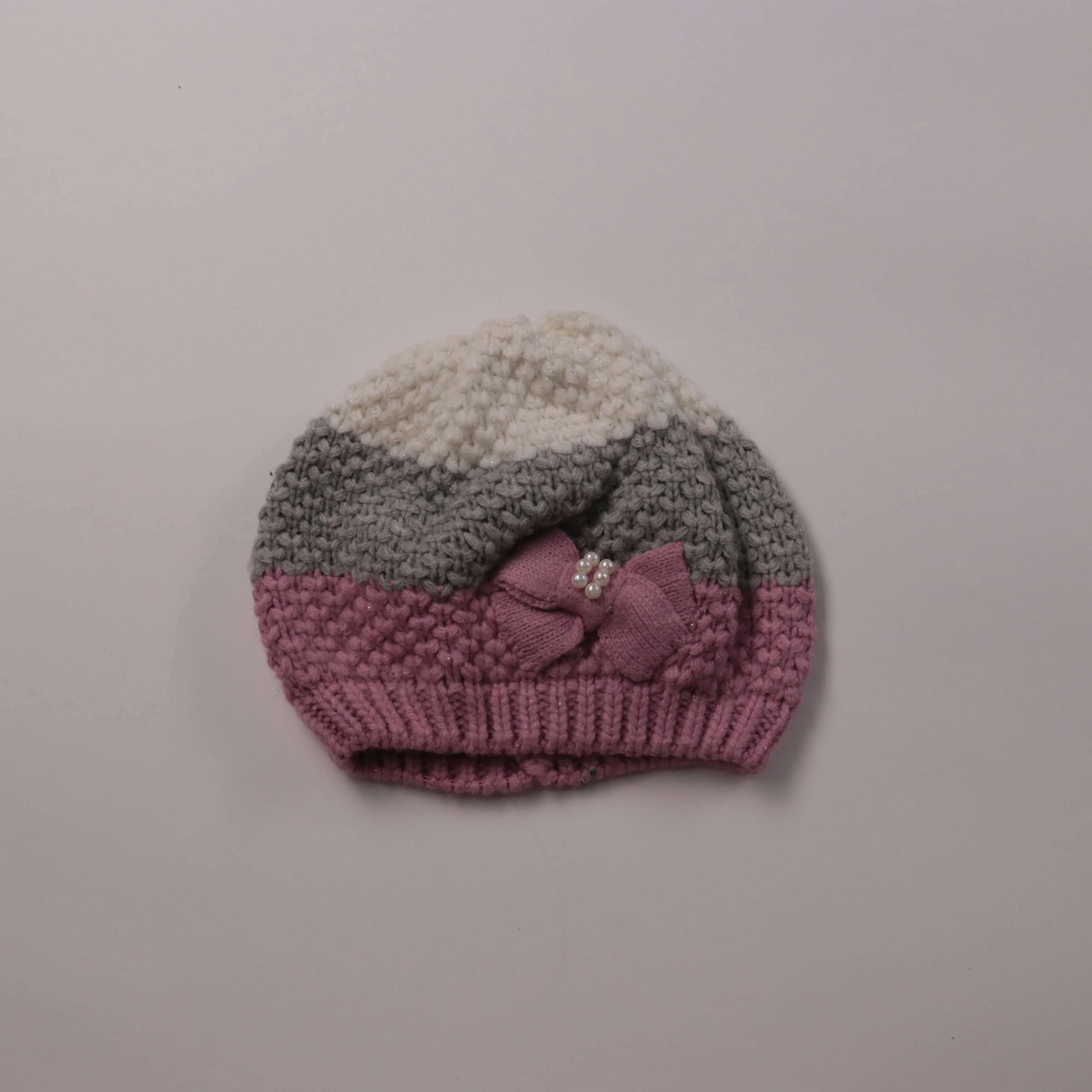 Вязаная шапка-бини в полоску (белый/серый/розовый) с декоративным бантом и бусинами. Подойдёт для зимних прогулок и повседневной носки, хорошо смотрится с пуховиком или пальто. Плотная вязка помогает сохранять тепло и защищает от ветра.