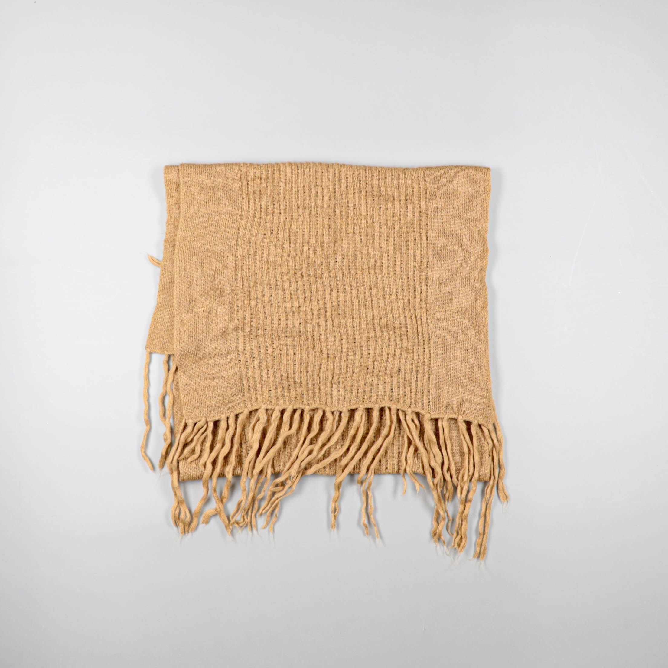 Вязаный шарф бежевого цвета с бахромой, подойдёт для прохладной погоды и повседневных образов. Удобно носить с пальто или курткой в осенне-весенний сезон. Мягкий материал хорошо драпируется и быстро согревает шею.