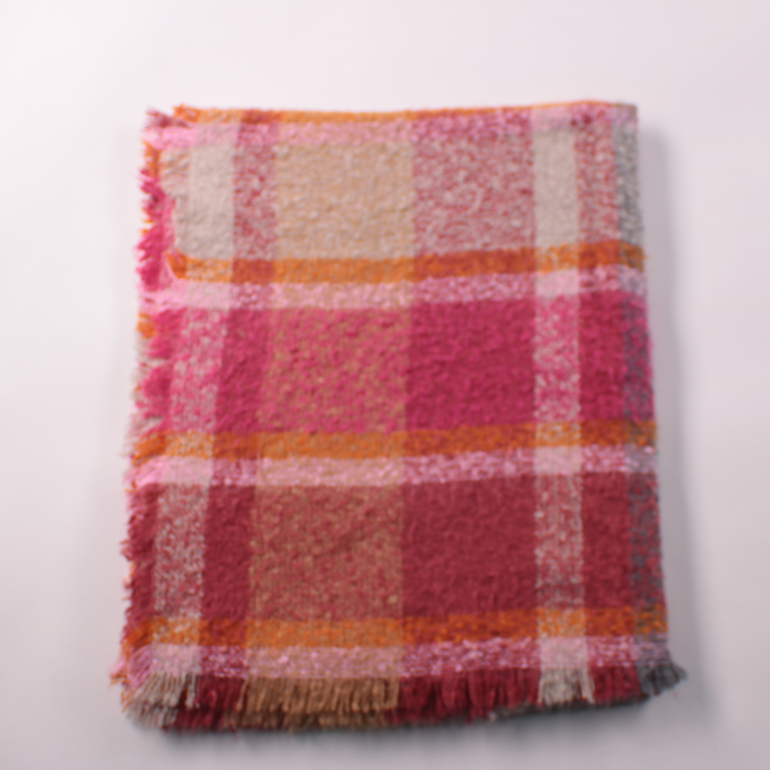 Шарф Dunnes Stores в крупную клетку в розово-бордовой гамме с оранжевыми акцентами и бахромой. Подойдёт для прохладной погоды — на осень/весну и как тёплый аксессуар зимой. Мягкий и лёгкий в уходе, удобно носить в разных способах.
