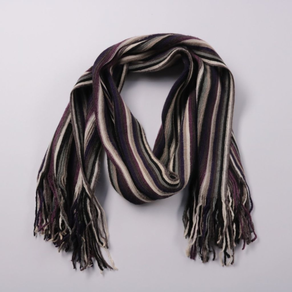 Полосатый шарф без бренда с кисточками по краям. Подойдёт на каждый день и легко сочетается с пальто или курткой в базовых цветах. Практичен тем, что хорошо драпируется и добавляет тепла в прохладную погоду.