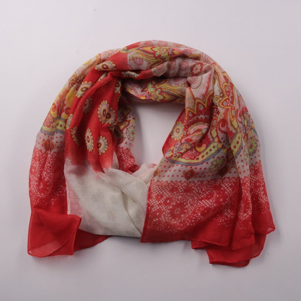 Лёгкий шарф с орнаментальным принтом в красно-бежевой гамме. Подойдёт для повседневных образов и как акцент к однотонной одежде, можно носить на шее или накидывать на плечи. Тонкая ткань удобно драпируется и компактно складывается в сумку.