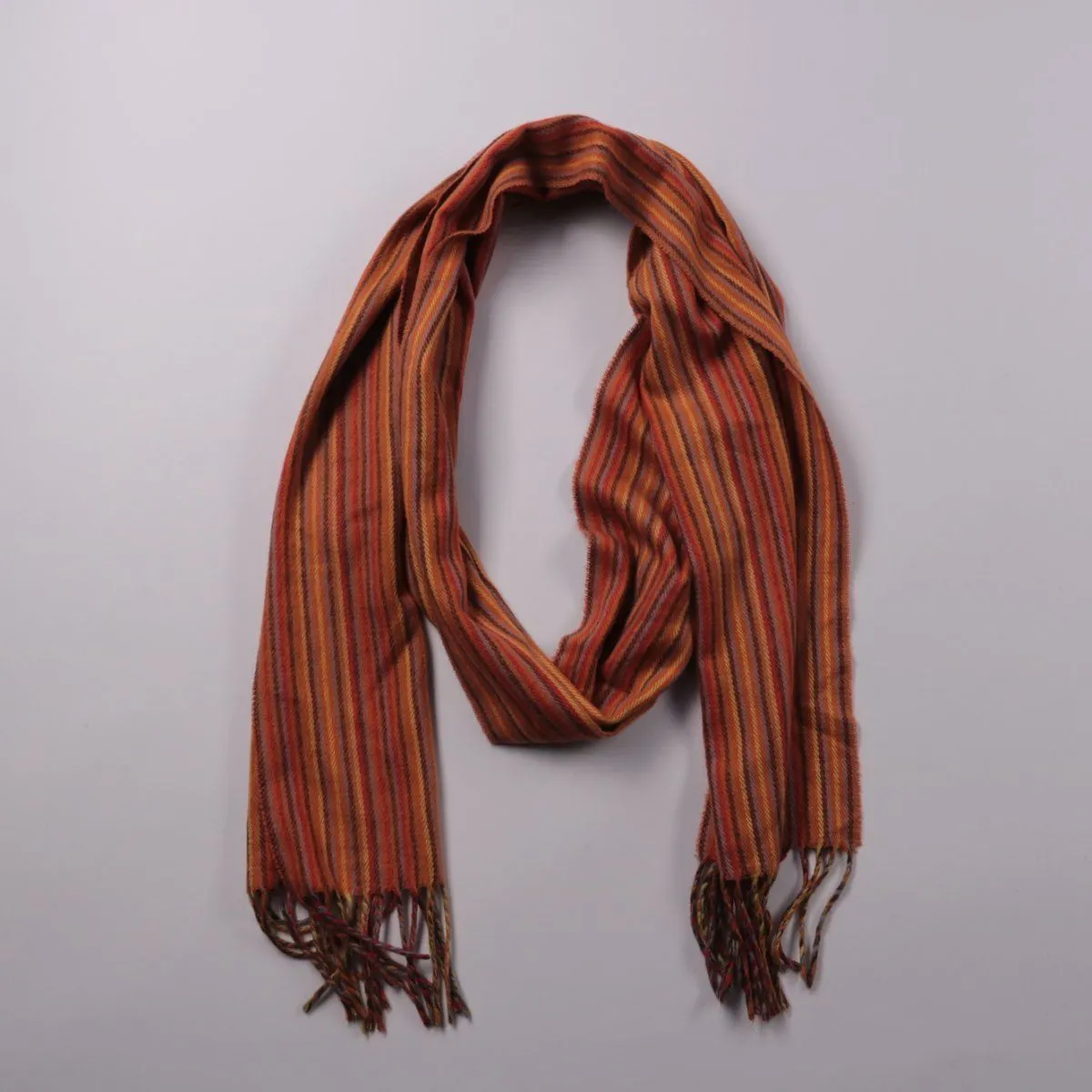 Шарф в полоску с кисточками, без указания бренда. Подойдёт для повседневных образов в прохладную погоду и в межсезонье. Легко сочетать с однотонной верхней одеждой, а длина позволяет завязывать разными способами.