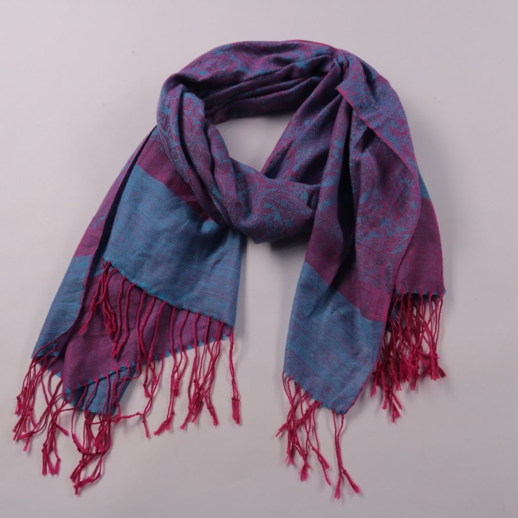 Шарф с бахромой, без указанного бренда, в сине-фиолетовой гамме с узором. Подойдёт для повседневных образов в прохладную погоду и как акцент к однотонной верхней одежде. Длинные кисти по краям позволяют красиво драпировать и завязывать разными способами.