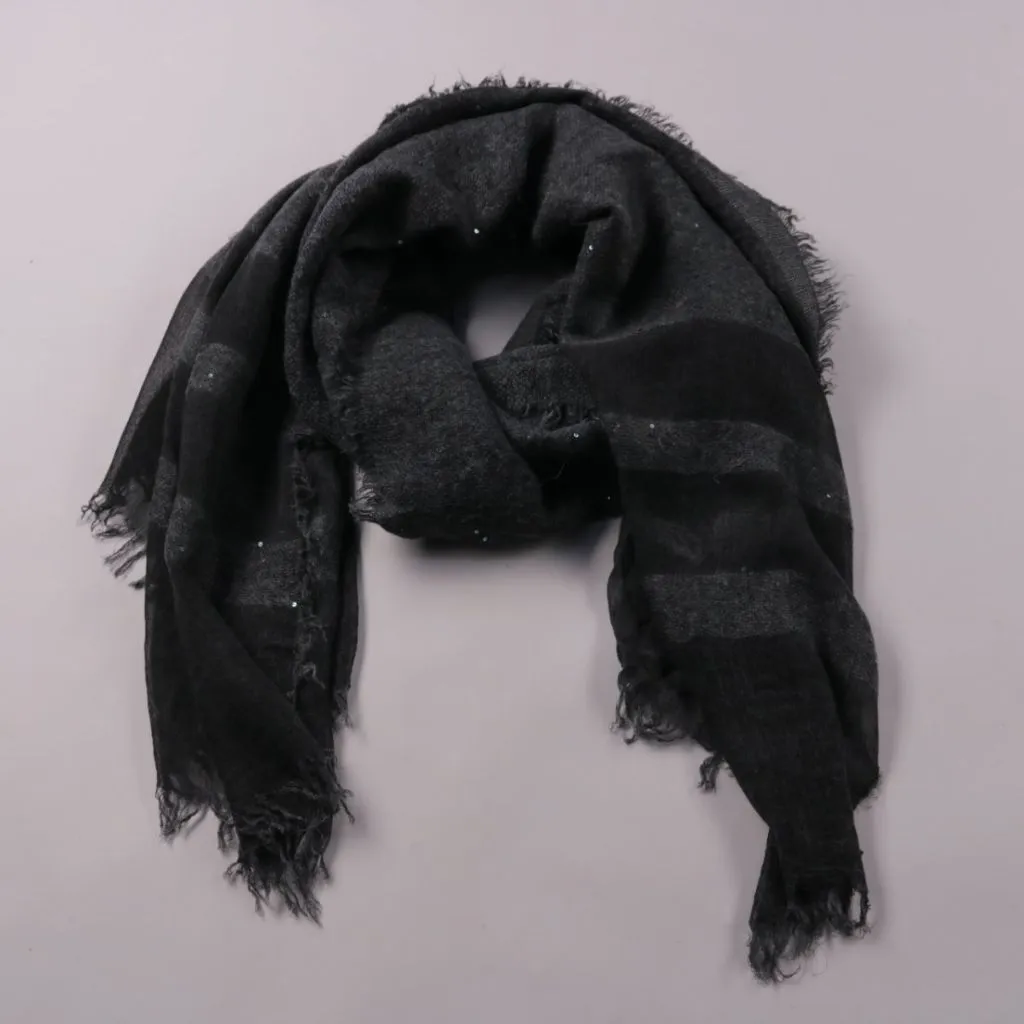Шарф без бренда, тёмный с полосатым узором и короткой бахромой по краям. Подойдёт для повседневных образов и в прохладную погоду поверх пальто или куртки. Легко складывается и не занимает много места в сумке.