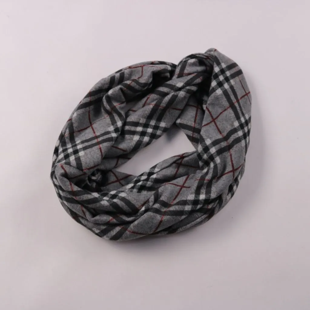 Шарф-снуд в серую клетку, без указания бренда. Подойдёт для прохладной погоды и легко сочетается с пальто или курткой в повседневных образах. Удобен тем, что надевается одним движением и не развязывается при носке.