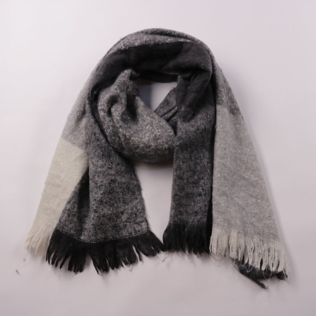Шарф с бахромой в серо-чёрно-белой гамме, без указания бренда. Подойдёт для повседневных образов в прохладную погоду и легко сочетается с пальто или курткой. Практичное преимущество — длинный формат позволяет завязывать разными способами и закрывать ше...