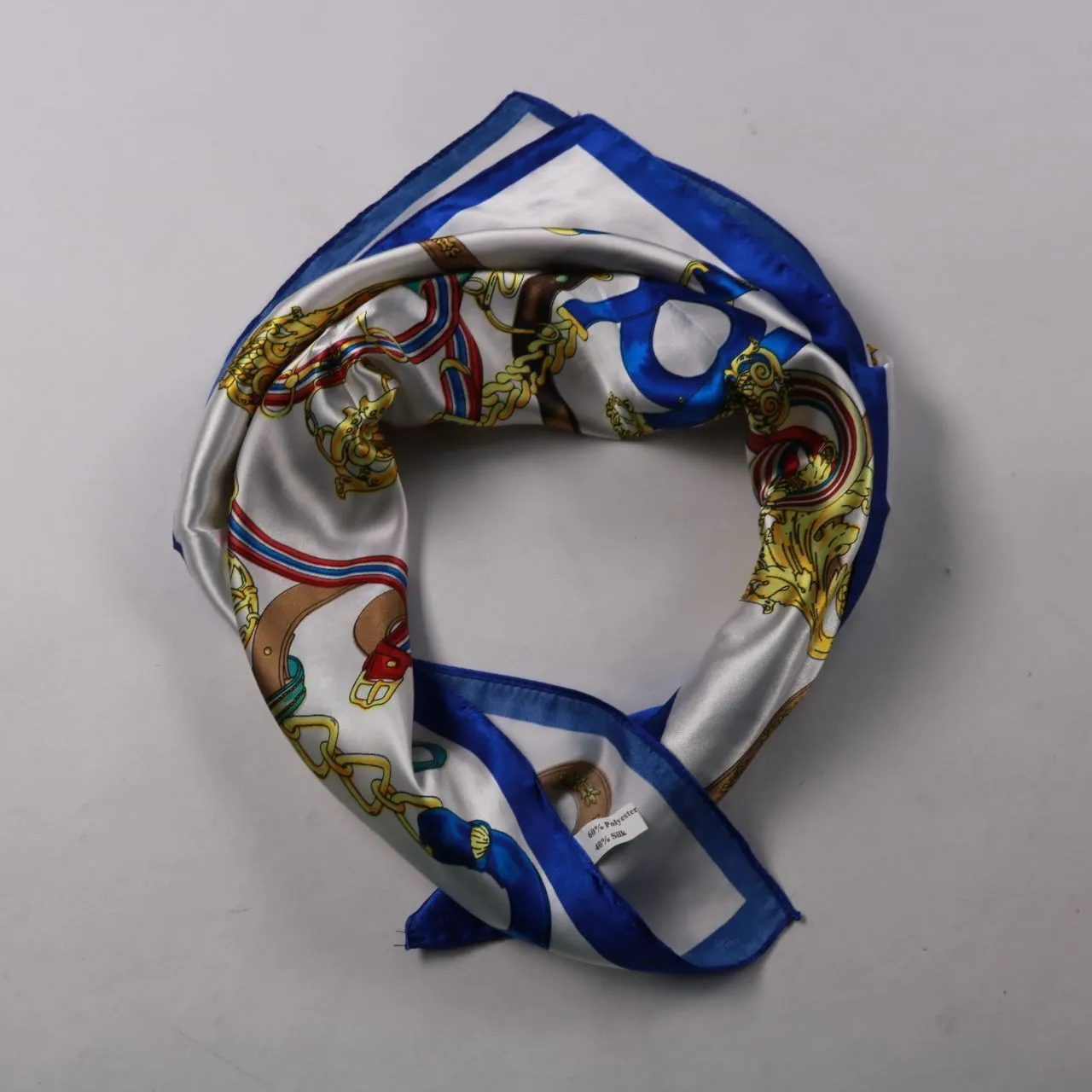 Квадратный платок с принтом в стиле ремней и цепочек и синим кантом, материал по бирке: 60% полиэстер и 40% шёлк. Подойдёт для шеи, на голову или на ручку сумки, чтобы добавить акцент в повседневные образы. Лёгкий и компактный — удобно брать с собой и ...
