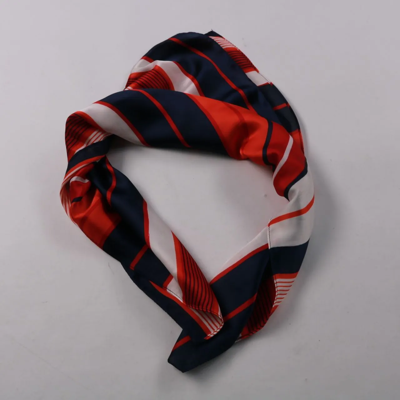 Платок с полосатым принтом в красно-сине-белой гамме, бренд не указан. Подойдёт для шеи, волос или как акцент на сумку в повседневных и офисных образах. Тонкая гладкая ткань легко складывается и занимает минимум места.