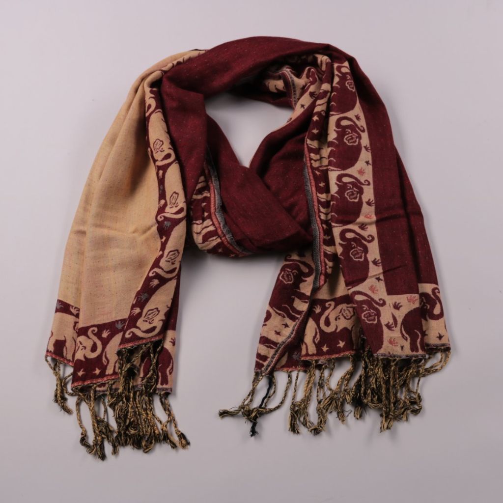 Шарф с рисунком по краю (бордово-бежевый орнамент) и кисточками. Подойдёт для повседневных образов и поездок, можно носить на шее или накидывать на плечи. Длинные бахрома по краям помогает красиво драпировать и фиксировать узел.