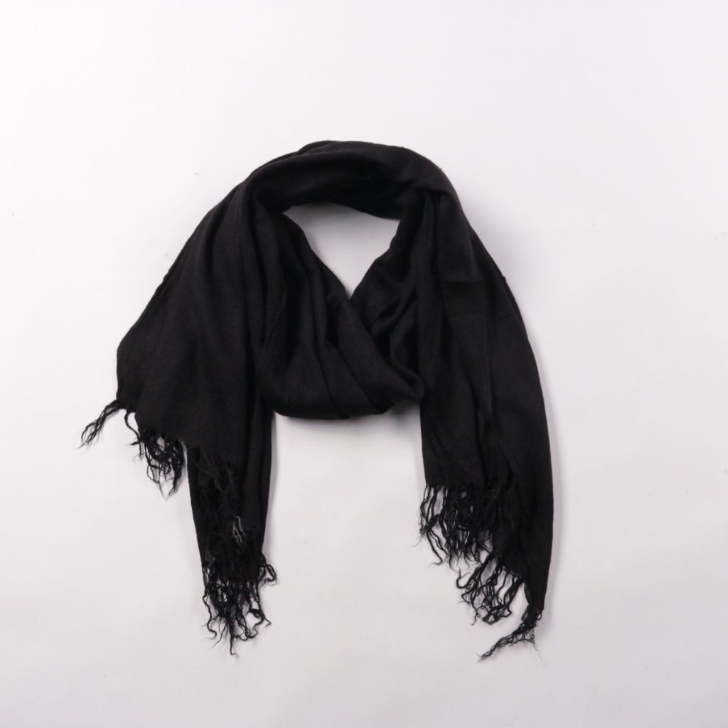 Чёрный шарф без указанного бренда, с бахромой по краям. Подойдёт для повседневных образов в прохладную погоду и легко сочетается с верхней одеждой разных цветов. Удобно драпируется и добавляет дополнительное тепло шее.