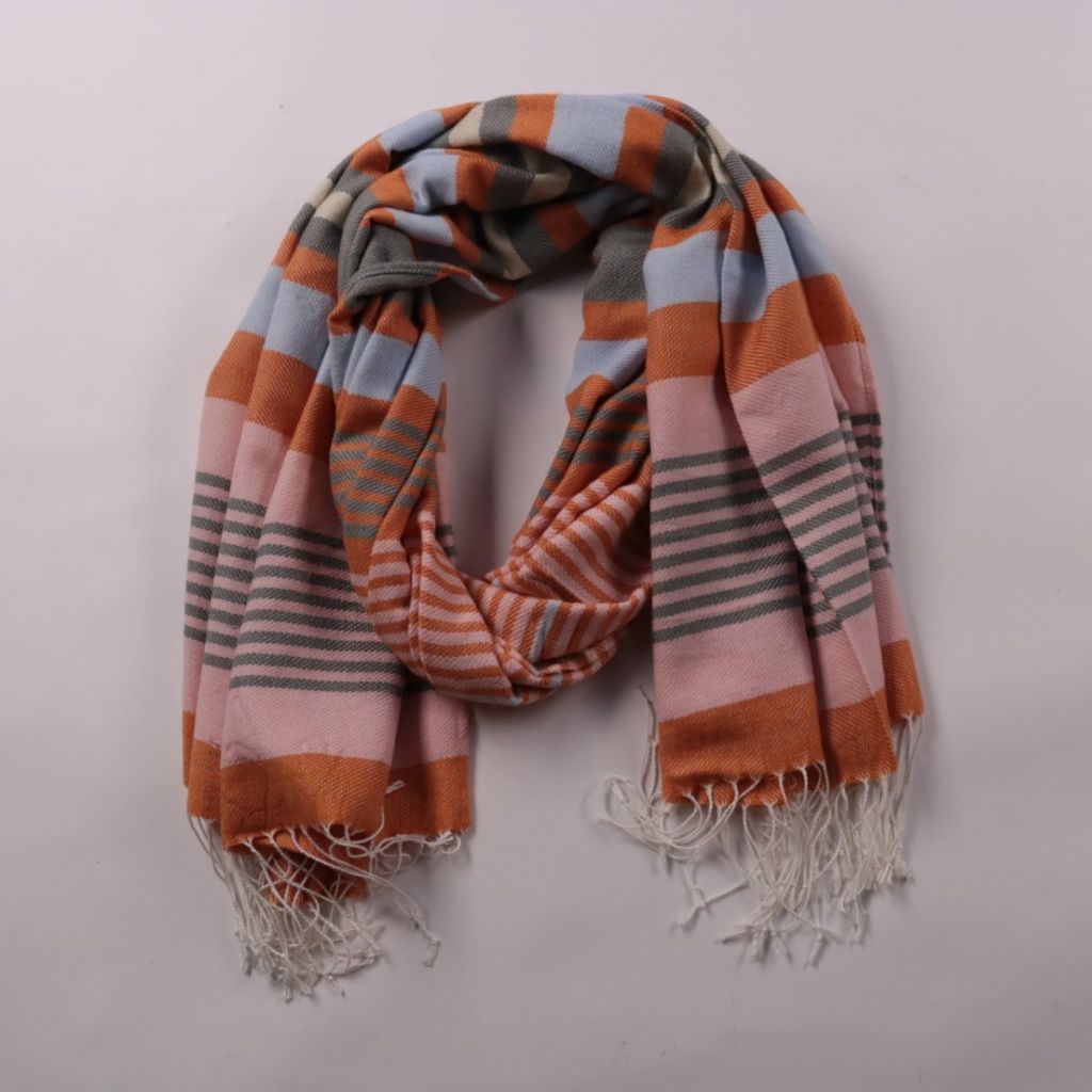 Шарф H&M в полоску с кисточками, мягкий и тёплый на ощупь. Подойдёт для прохладной погоды и многослойных образов в городе или в поездках. Акрил в составе прост в уходе и быстро сохнет после стирки.