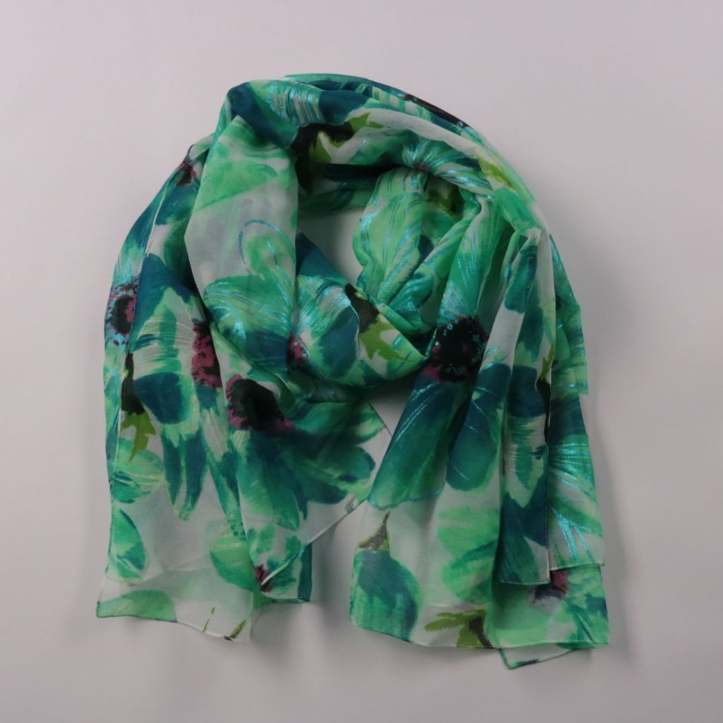 Лёгкий шарф с крупным цветочным принтом в зелёно-бирюзовых оттенках. Подойдёт для повседневных образов и как акцент к однотонным платьям, рубашкам или пальто в межсезонье. Ткань тонкая, шарф легко драпируется и занимает мало места в сумке.