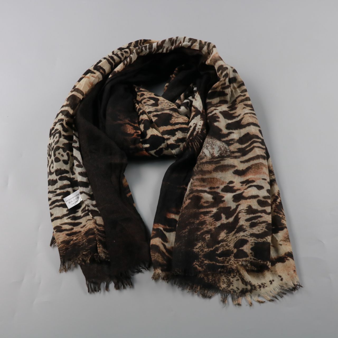 Шарф с анималистичным принтом в коричнево-бежево-чёрной гамме и бахромой по краю. Подойдёт для повседневных образов и как акцент к однотонной верхней одежде. Лёгкий полиэстер быстро сохнет и почти не мнётся.