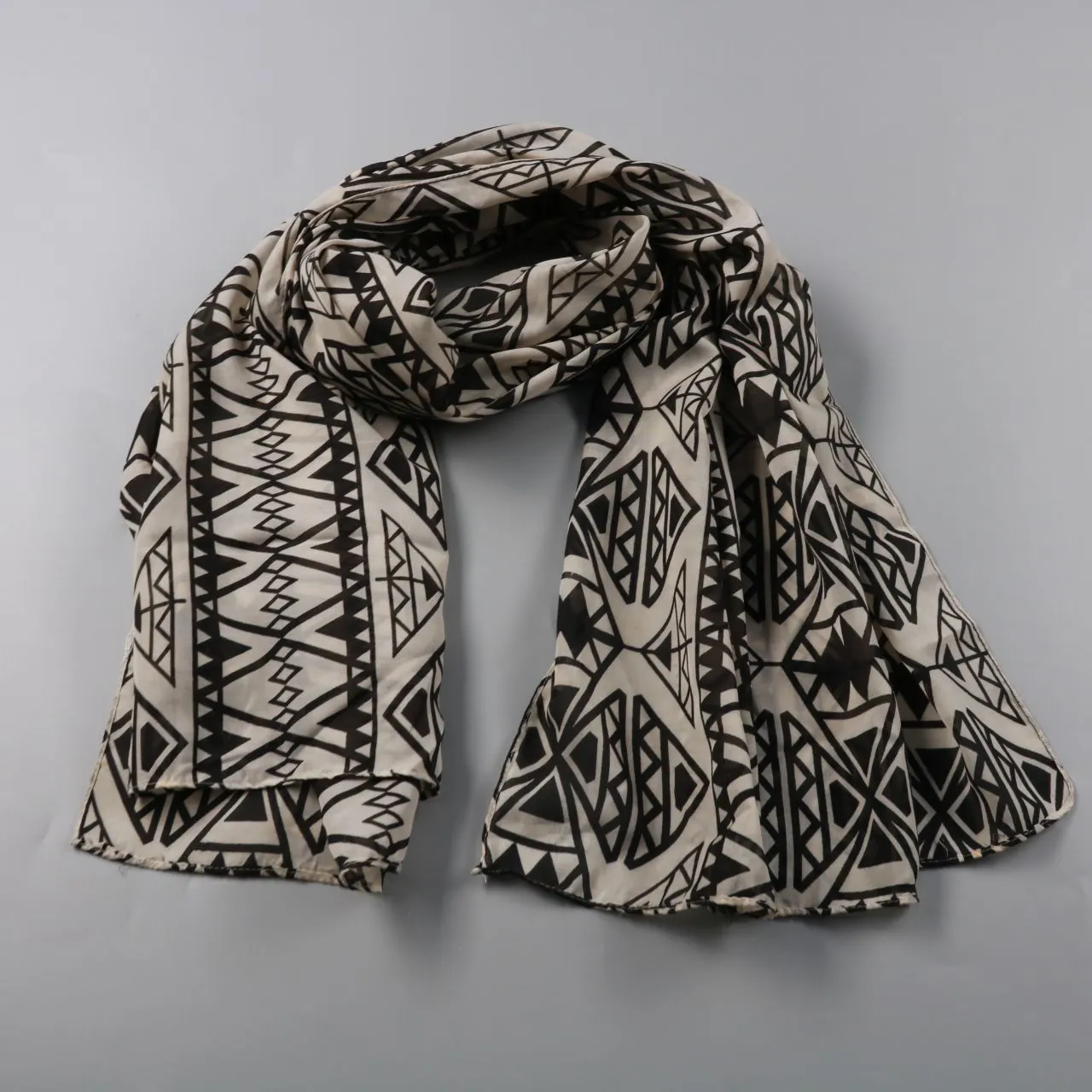 Шарф с геометрическим чёрно-белым принтом, без указания бренда. Подойдёт для повседневных образов и как акцент к однотонной верхней одежде в демисезон и прохладными вечерами. Лёгкая ткань удобно драпируется и не занимает много места в сумке.