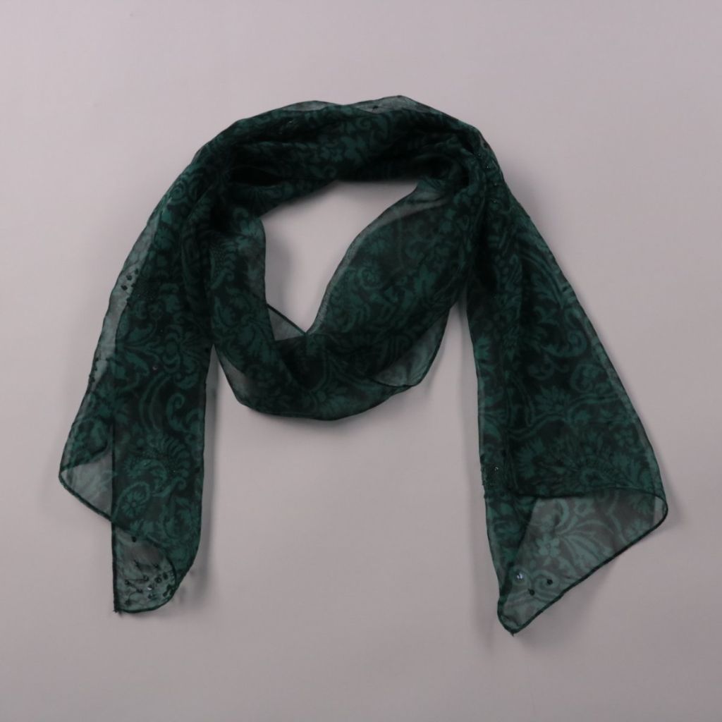 Лёгкий шарф с узорчатым принтом в тёмно-зелёной гамме, бренд не указан. Подойдёт для повседневных образов и как акцент к однотонной верхней одежде в демисезон. Тонкая ткань легко драпируется и компактно складывается в сумку.