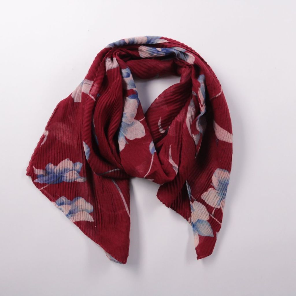 Лёгкий шарф с цветочным принтом на бордовом фоне, без указания бренда. Подойдёт для повседневных образов и как акцент к однотонной верхней одежде в демисезон. Тонкая ткань легко драпируется и компактно складывается в сумку.
