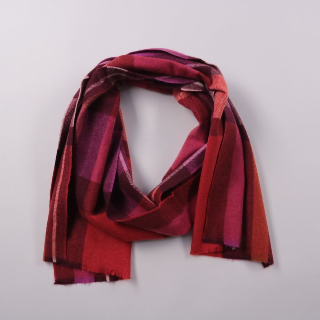 Шарф в клетку в бордово-фиолетовой гамме, мягкий и приятный на ощупь. Подойдёт для повседневных образов и офисного стиля в прохладную погоду. Хорошо драпируется и легко сочетается с однотонной верхней одеждой.