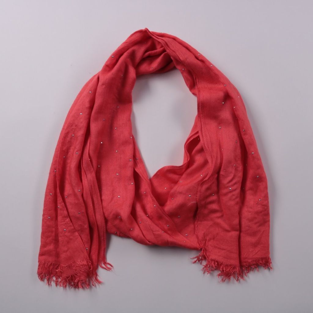 Красный шарф без указания бренда, украшен мелкими декоративными стразами и имеет бахрому по краям. Подойдёт для повседневных образов и как акцент к однотонной верхней одежде в прохладную погоду. Легко драпируется и добавляет образу цвет без лишнего объ...