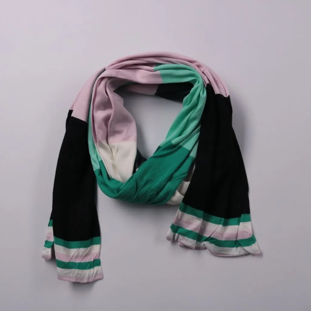 Шарф с геометрическим принтом в пастельных тонах с чёрными вставками и полосатой окантовкой. Подойдёт для повседневных образов и в качестве лёгкого слоя в прохладную погоду. Мягко драпируется и удобно завязывается разными способами.
