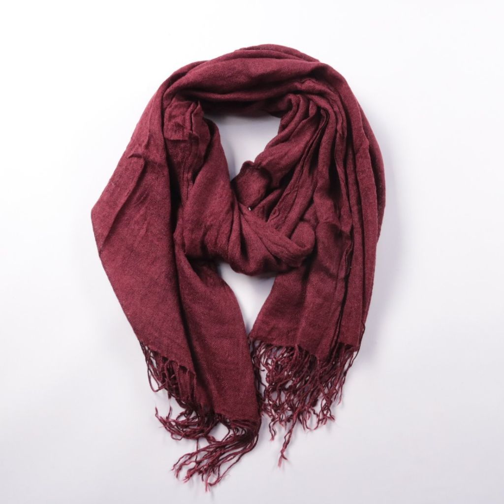 Шарф бордового цвета с декоративной бахромой по краям. Подойдёт для повседневных образов в прохладную погоду и легко сочетается с верхней одеждой. Мягкая ткань удобно драпируется и можно завязывать разными способами.