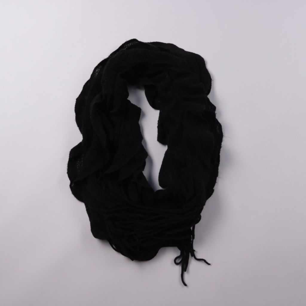 Чёрный шарф с бахромой из лёгкой тонкой ткани. Подойдёт для повседневных и более строгих образов в прохладную погоду. Компактно складывается и удобно носить с собой.