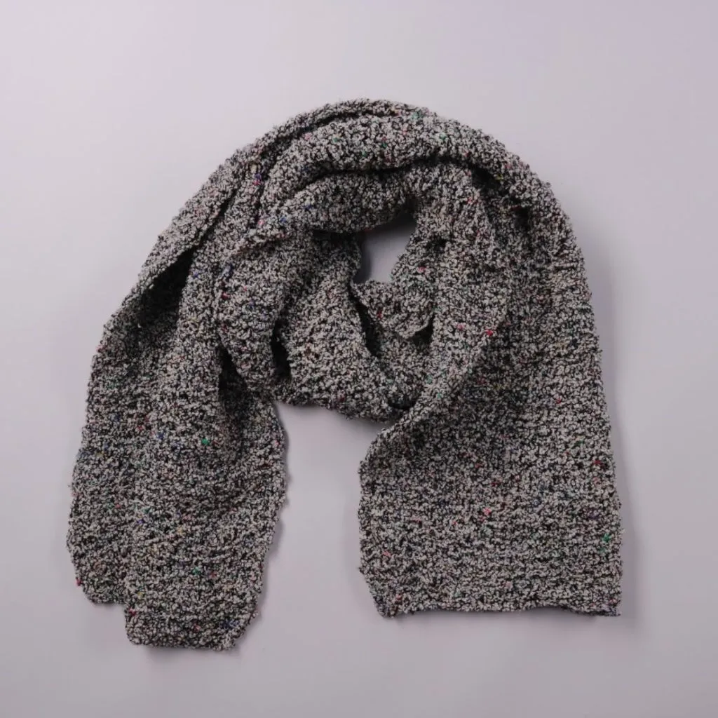 Вязаный шарф крупной фактуры без бренда, серого меланжа с цветными вкраплениями. Подойдёт для зимних прогулок и повседневных образов, легко сочетается с верхней одеждой. Мягкая объёмная вязка хорошо сохраняет тепло и приятно лежит на шее.