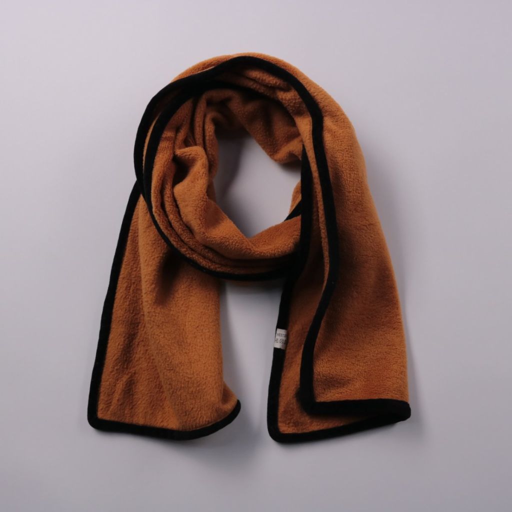 Мягкий флисовый шарф без бренда коричневого цвета с чёрной окантовкой по краю. Подойдёт для повседневной носки в холодную погоду, чтобы утеплить шею под куртку или пальто. Практичное преимущество — лёгкий, быстро сохнет и прост в уходе.