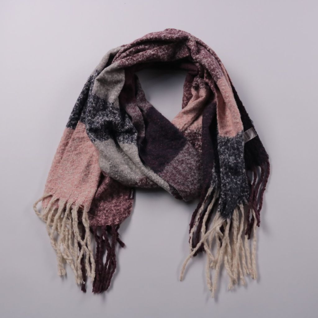 Шарф FatFace в клетку с кисточками, в розово-серо-бордовой гамме. Подойдёт для повседневной носки в холодную погоду, можно носить как шарф или накидывать как палантин. Акриловый материал мягкий и простой в уходе.