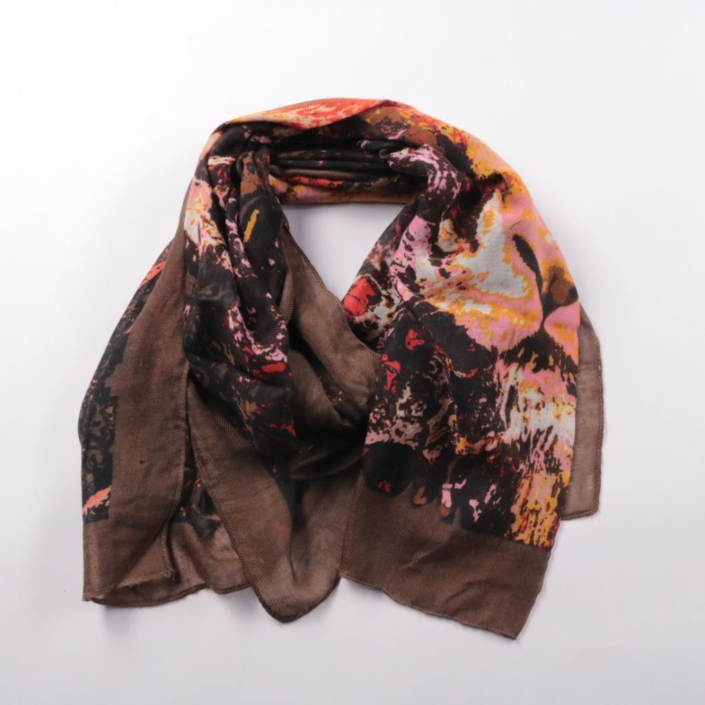 Платок с абстрактным принтом в коричнево-чёрной гамме с яркими акцентами. Подойдёт для повседневных образов и как акцент на пальто или куртку в межсезонье. Легко складывается и не занимает много места в сумке.