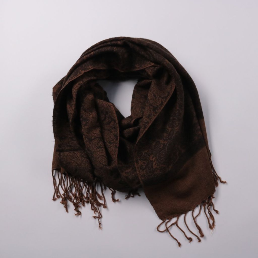 Шарф с узорчатым жаккардовым рисунком в коричневой гамме и кисточками по краям. Подойдёт для повседневных образов и офиса в прохладную погоду. Легко драпируется и добавляет тепла без лишнего объёма.