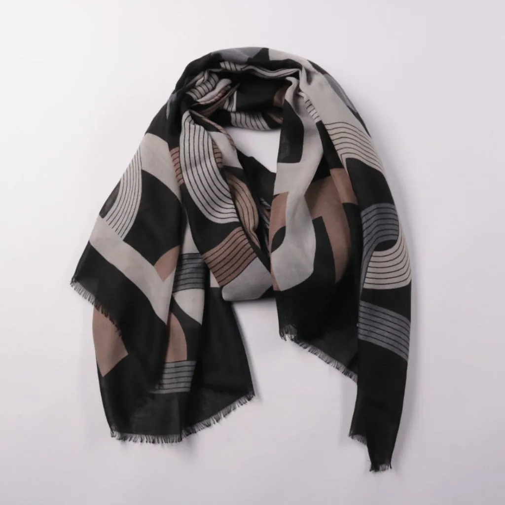 Шарф с геометрическим принтом в чёрно-серо-бежевой гамме и мягкой бахромой по краю. Подойдёт для повседневных образов и как акцент к однотонной верхней одежде. Смесь вискозы и хлопка делает его лёгким и комфортным в носке.