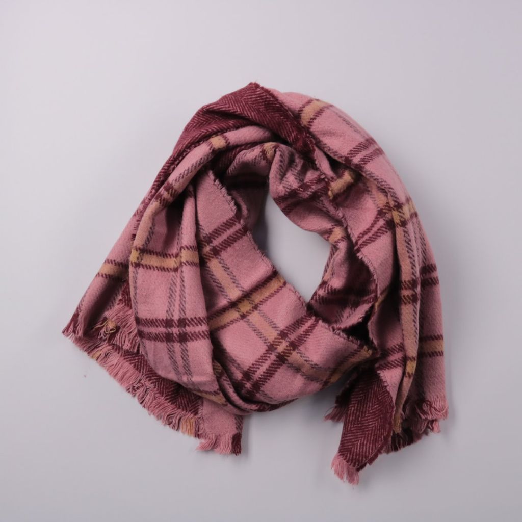 Шарф в клетку в розово-бордовой гамме с бахромой по краю. Подойдёт для повседневных образов в прохладную погоду, можно носить как шарф или накидывать на плечи. Мягкая ткань хорошо драпируется и добавляет тепла.