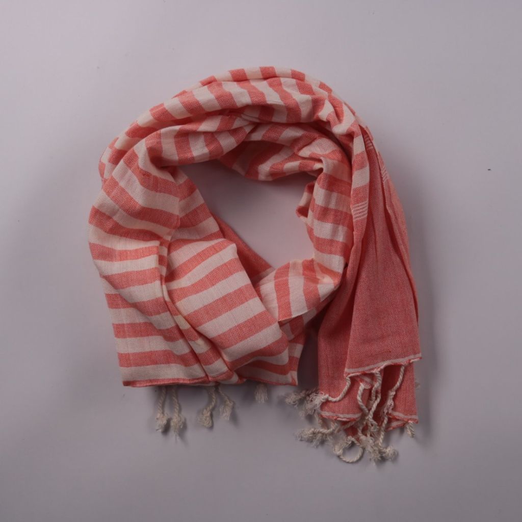 Лёгкий шарф в розово-белую полоску с кисточками по краю. Подойдёт для повседневных образов и поездок, когда нужно добавить мягкий акцент и немного утеплиться. Легко складывается и почти не занимает места в сумке.