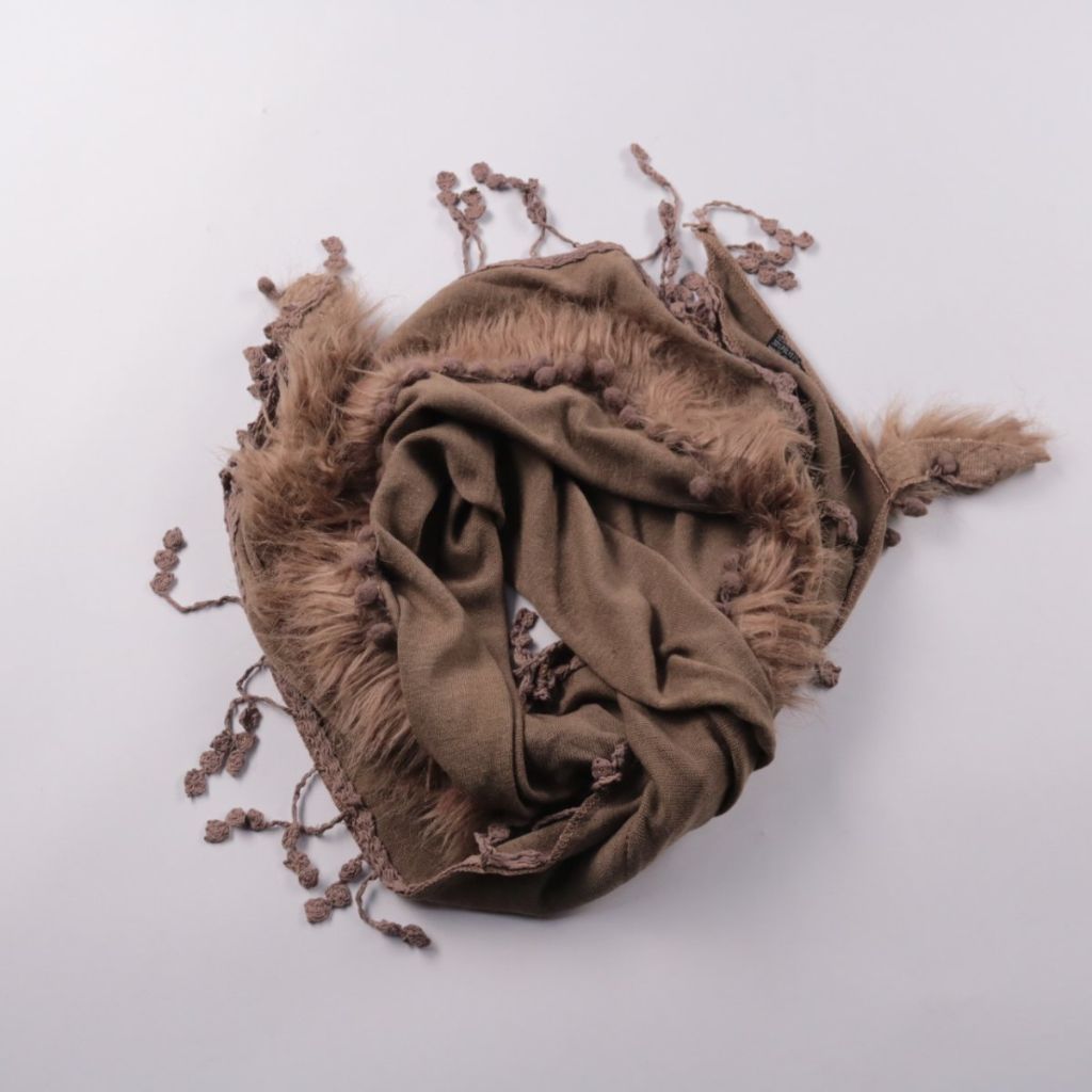 Шарф коричневого цвета с отделкой под мех по краю и декоративными кисточками. Подойдёт для зимних прогулок и повседневных образов, можно носить как шарф или накидывать на плечи. Плотный материал хорошо сохраняет тепло и добавляет объём у горловины.