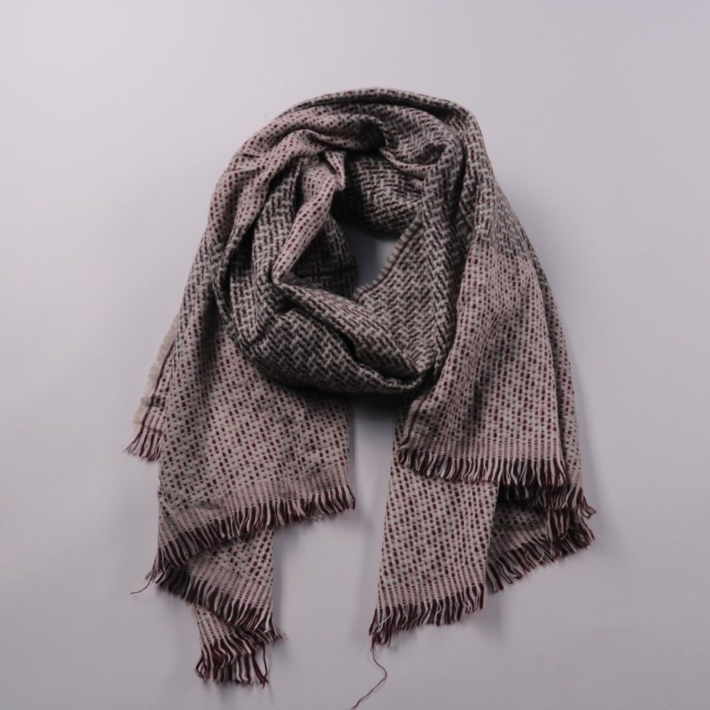 Шарф без бренда с бахромой и фактурным узором в серо-бордовой гамме. Подойдёт для повседневных образов в прохладную погоду, легко сочетается с пальто и куртками. Большой размер позволяет носить его как шарф или как накидку на плечи.