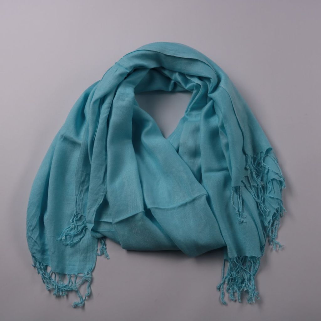 Лёгкий однотонный шарф-палантин без бренда в голубом (бирюзовом) оттенке, с кисточками по краям. Подойдёт для города и поездок, чтобы накинуть на плечи или носить на шее в прохладную погоду. Тонкая ткань компактно складывается и удобно помещается в сумку.