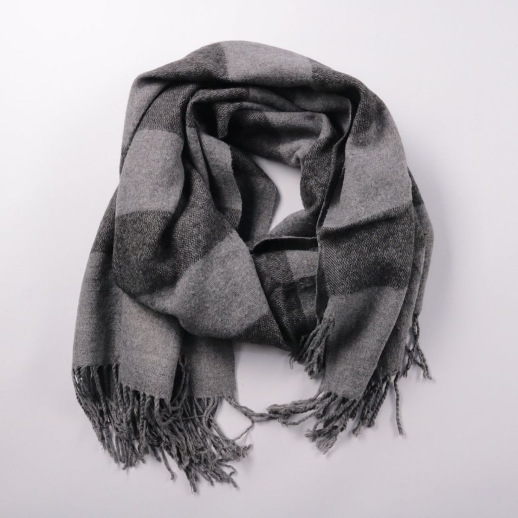 Шарф в серо-графитовую полоску с бахромой по краям. Подойдёт для повседневных образов и поездок в холодную погоду, легко сочетается с пальто и куртками. Достаточно широкий, чтобы удобно укутаться и защитить шею от ветра.