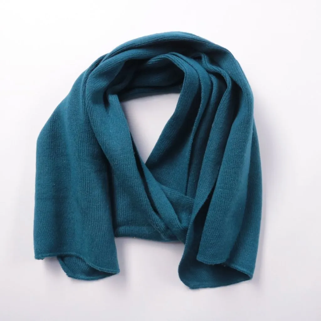 Вязаный шарф спокойного сине-бирюзового оттенка без видимых логотипов. Подойдёт для повседневных образов в прохладную погоду, легко сочетается с пальто и куртками. Мягкий трикотаж удобно драпируется и даёт дополнительное утепление шеи.