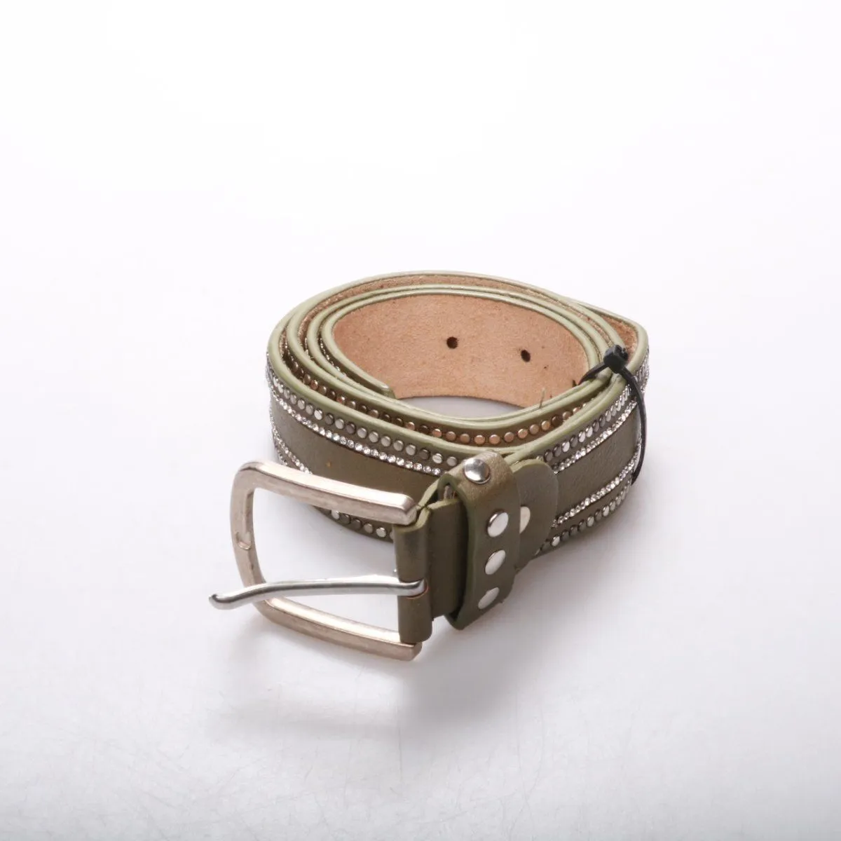 Ремень из полиуретана с внутренней стороной из кожи, с металлической пряжкой и декоративными заклёпками. Подойдёт для джинсов и брюк в повседневных образах. Практичный вариант: заклёпки заявлены как никель‑фри, меньше риск раздражения кожи.